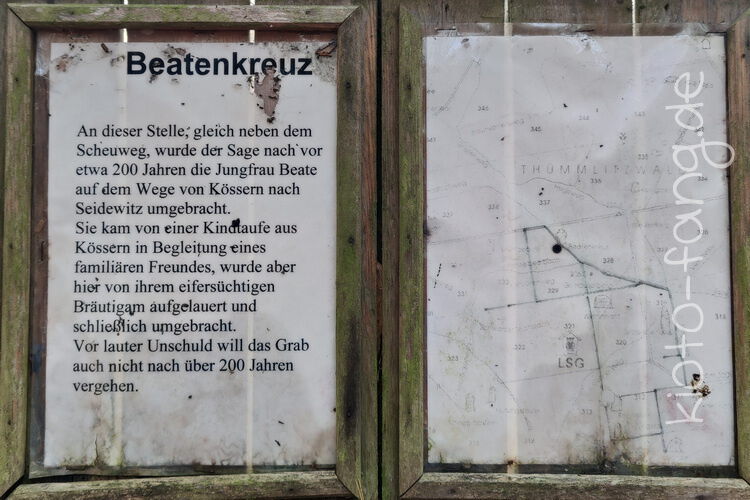 "An dieser Stelle, gleich neben dem Scheuweg, wurde der Sage nach vor etwa 200 Jahren die Jungfrau Beate auf dem Wege von Kössern nach Seidewitz umgebracht. Sie kam von einer Kindtaufe aus Kössern in Begleitung eines familiären Freundes, wurde aber hier von ihrem eifersüchtigen aufgelauert und schließlich umgebracht. Vor lauter Unschuld will das Grab auch nicht nach über 200 Jahren vergehen."