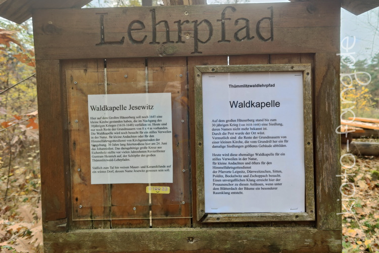 "Hier auf dem Großen Häuserberg soll noch 1645 eine kleine Kirche gestanden haben, die im Nachgang des 30jährigen Krieges (1618-1648) verfallen ist. Heute sind nur noch Reste der Grundmauern von 8 m x 4 m vorhanden. Die Waldkapelle wird noch besucht für ein stilles Verweilen in der Natur, für Andachten oder für den Himmelfahrtsgottesdienst von Kirchgemeinden der Umgebung.