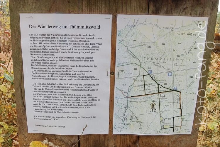 Der Wettinplatz mit dem Wettinstein (Gedenkstein), der 1889 zum 800-jährigen Regierungsjubiläum des sächsischen Herrscherhauses der Wettiner errichtet wurde ist Punkt Nummer 15 auf dem Waldlehrpfad im Thümmlitzwald.
