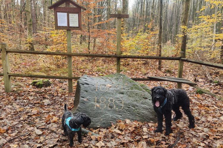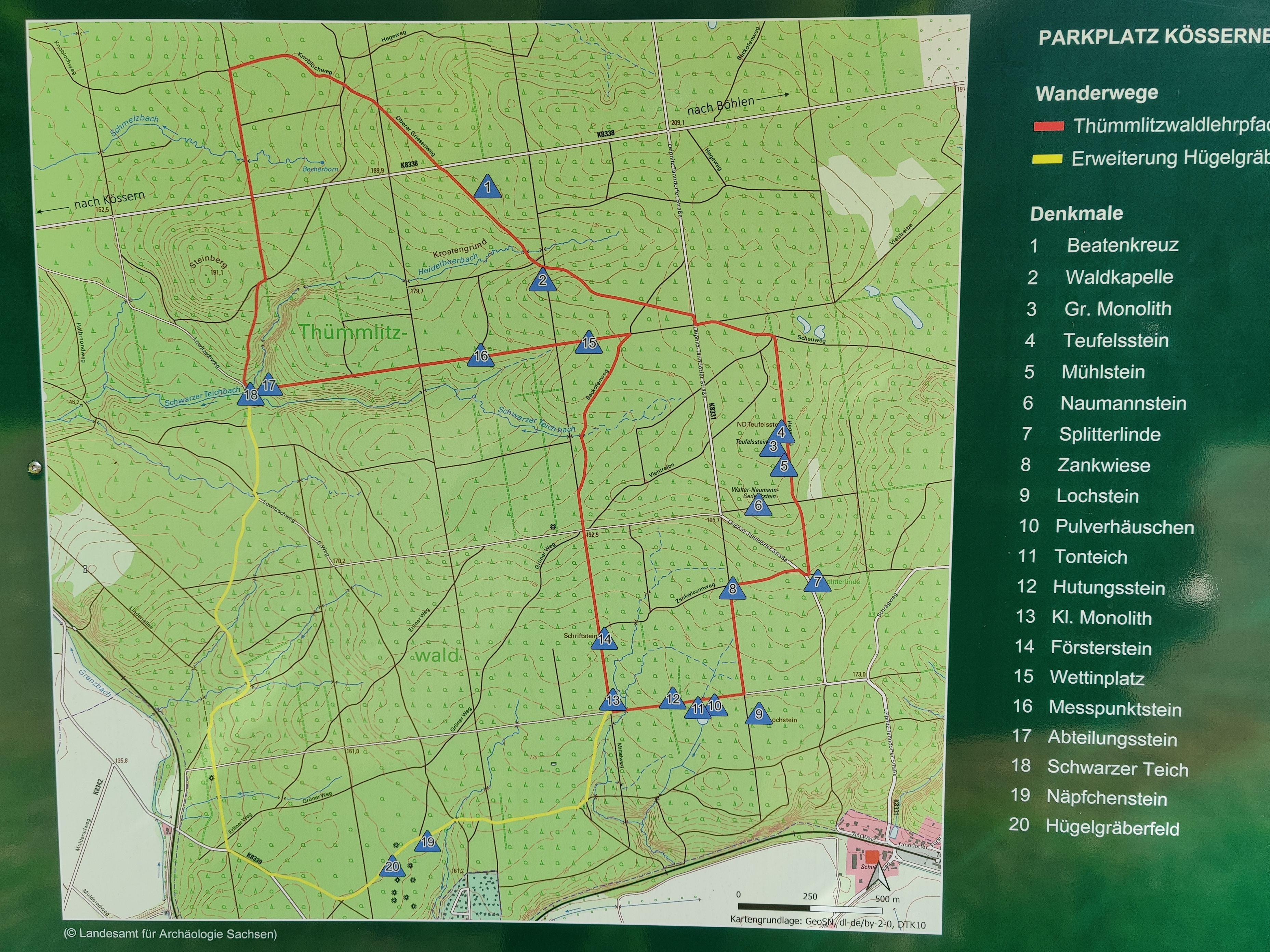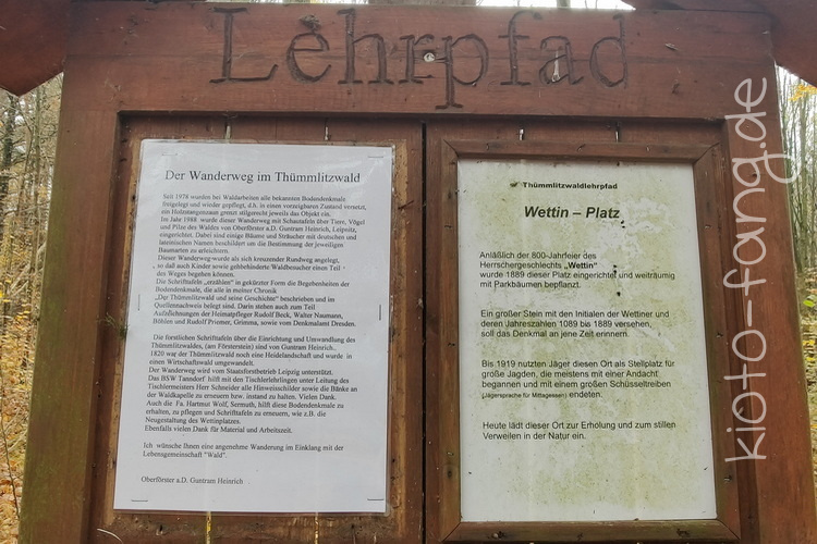 Der Wettinplatz mit dem Wettinstein (Gedenkstein), der 1889 zum 800-jährigen Regierungsjubiläum des sächsischen Herrscherhauses der Wettiner errichtet wurde ist Punkt Nummer 15 auf dem Waldlehrpfad im Thümmlitzwald.