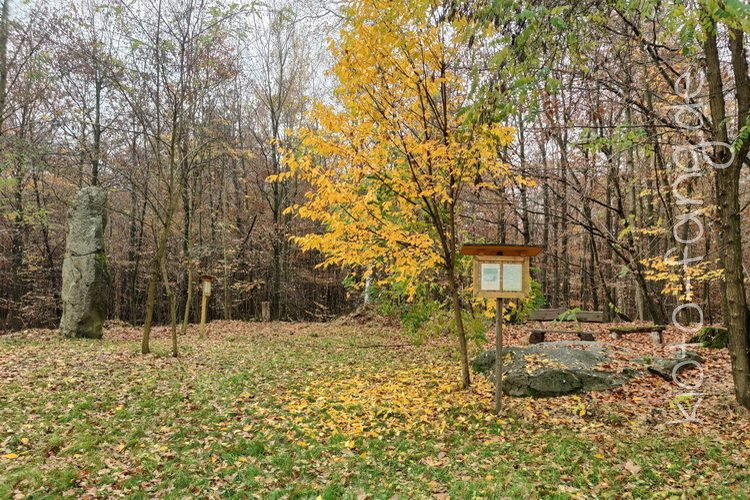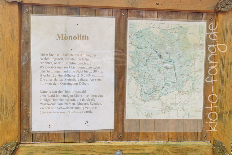 "Diese Steinsäule diente am Anfang der Besiedlungszeit, auf kleinen Hügeln errichtet, so der Erzählung nach als Wegweiser und zur Orientierung zwischen den Siedlungen auf eine Sicht bis zu 30 km. Hier beträgt die Höhe ca. 210 m ü.NN. Die allernächste Steinsäule dieser Art steht kurz vorm dem Ortseingang Döben.
