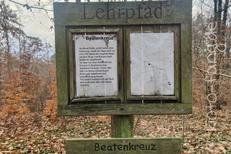 "An dieser Stelle, gleich neben dem Scheuweg, wurde der Sage nach vor etwa 200 Jahren die Jungfrau Beate auf dem Wege von Kössern nach Seidewitz umgebracht. Sie kam von einer Kindtaufe aus Kössern in Begleitung eines familiären Freundes, wurde aber hier von ihrem eifersüchtigen aufgelauert und schließlich umgebracht. Vor lauter Unschuld will das Grab auch nicht nach über 200 Jahren vergehen."