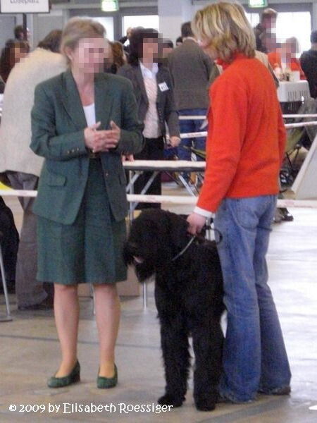 Harmonisch aufgebauter Rüde, Kopf etwas feminin, fehlt noch Vorbrust, komplettes Scherengebiss, lackschwarzes hartes Haar, zügiger Bewegungsablauf mit viel Schub, in der Vorderhand leicht eng