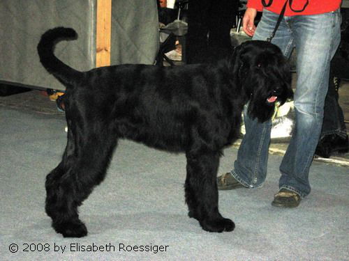 17 Monate alter Rüde, schöner Kopf, braunes ovales Auge, hoch angesetztes Ohr, eleganter Hals, etwas langer Rücken, korrekte Winkelung, Vorderhand durchtretend, gute Vorbrust und Brust, hartes schwarzes Haarkleid, lebhaftes freundliches Wesen, korrekte Bewegung.