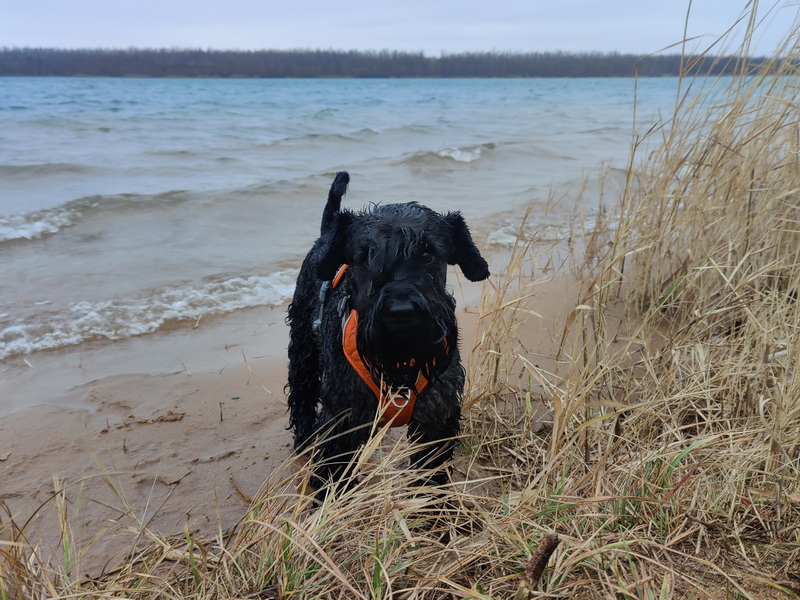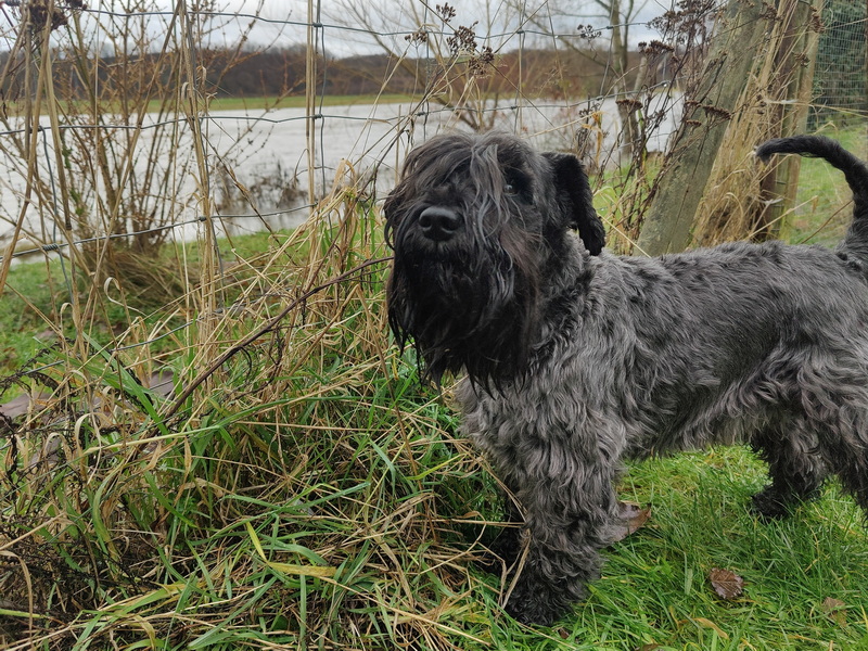 Ich treffe zum ersten Mal auf eine Russische Schwarze Terrier Hündin.