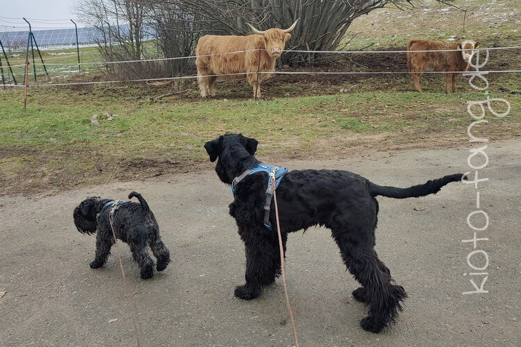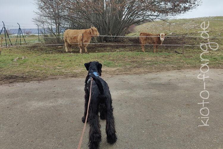 Beim Spaziergang trafen die Jungs auf ein hübsches Hochlandrind mit Kalb.